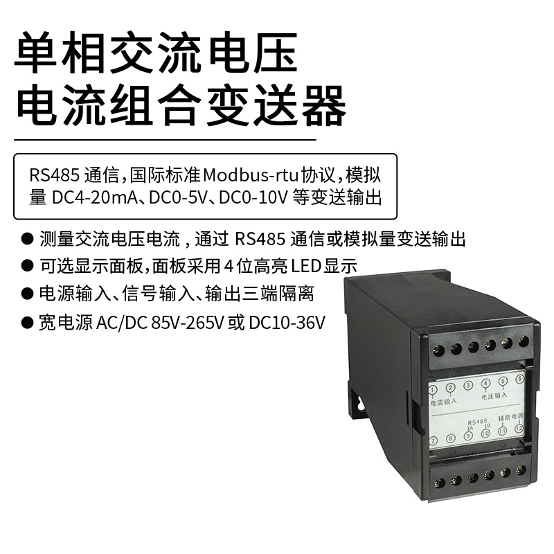 HY194-BS4UI單相交流電壓電流組合變送器,是一種把輸入的交流電壓電流隔離轉(zhuǎn)換成線性直流模擬信號(hào)輸出(2路模擬量輸出,1路對(duì)應(yīng)電壓,1路對(duì)應(yīng)電流)或RS485數(shù)字通信接口輸出。模擬量可選:DC0~20mA、DC4~20mA、DC0~5V、DC1~5V、DC0~10V等變送輸出。RS-485數(shù)字通訊接口,采用國際標(biāo)準(zhǔn)MODBUS-RTU通訊協(xié)議,可與各種PLC、HMI、組態(tài)軟件實(shí)現(xiàn)組網(wǎng)。
