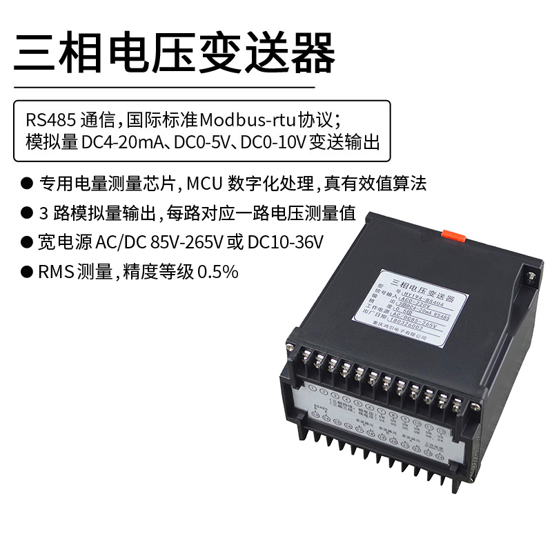 三相電壓變送器,通過專用電量芯片采樣,CPU 數字化處理,真有效值算法,高精度的測量三相電壓,隔離轉換成線性直流標準模擬信號輸出或RS485數字通信接口輸出。模擬量可選:DC0~20mA、DC4~20mA、DC0~5V、DC1~5V、DC0~10V等變送輸出;RS-485數字通訊接口,采用國際標準MODBUS-RTU通訊協議,可與各種PLC、HMI、組態軟件實現組網。