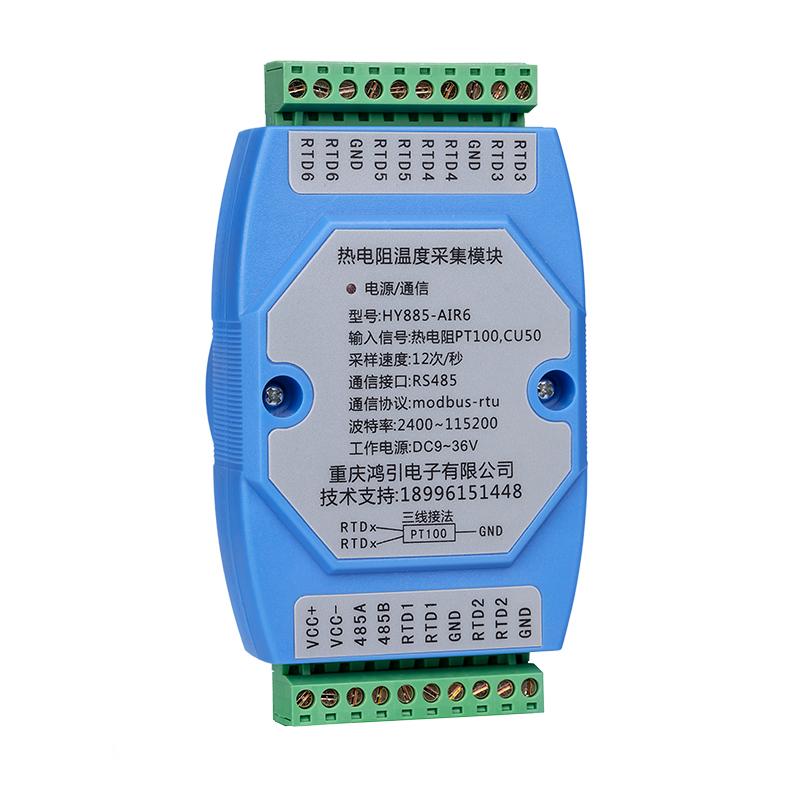 測量6路熱電阻溫度信號,通過RS485接口輸出。熱電阻信號輸入與工作電源、RS485之間隔離。RS485通信采用標準modbus-rtu協議,可與各種組態軟件,PLC,觸摸屏聯網。出廠預設RS485通信參數:模塊地址1,波特率9600,8個數據位,無校驗位,1位停止位,用戶通過上位機參數設置軟件修改通信參數。