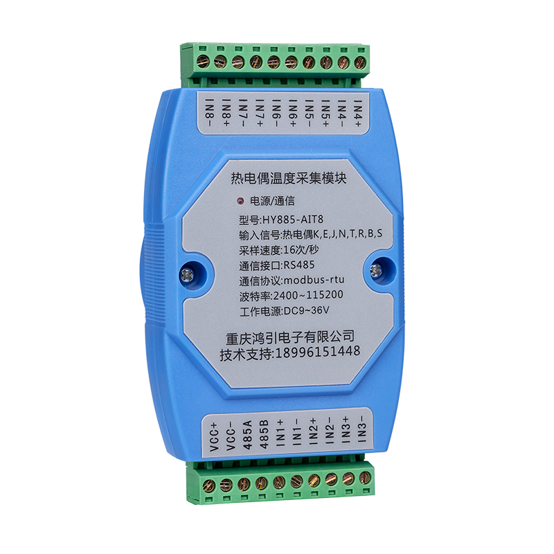 測量8路熱電偶溫度信號,通過RS485接口輸出。熱電偶信號輸入與工作電源、RS485之間隔離。RS485通信采用標準modbus-rtu協議,可與各種組態軟件,PLC,觸摸屏聯網。出廠預設RS485通信參數:模塊地址1,波特率9600,8個數據位,無校驗位,1位停止位,用戶通過上位機參數設置軟件修改通信參數。